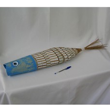 ARTESANATO EM FORMA DE PEIXE (96X16X7,5 CM), CONFECCIONADO COM VARETAS DE MADEIRA E BAMBU (ARMAÇÃO DO CORPO); PAPÉIS EM TONS DE AZUL TRANÇADOS PELO CORPO; E CABEÇA EM PAPELÃO PINTADO DE AZUL. ACOMPANHA CARTÃO DE VISITA DO REMETENTE.