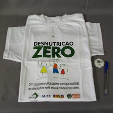 CAMISETA (TAM G) EM MALHA BRANCA, DE MANGA CURTA. NA FRENTE, ESTAMPA COM DESENHO INFANTILIZADO DE TRÊS CRIANÇAS, E A INSCRIÇÃO 'DESNUTRIÇÃO ZERO / O 1º PROGRAMA MULTIDISCIPLINAR MUNICIPAL DO BRASIL QUE OFERECE CAFÉ DA MANHÃ ALMOÇO E JANTA ÀS CRIANÇAS CARENTES. / BNDES / CAIXA / GOVERNO FEDERAL / PREFEITURA DO MUNICÍPIO DE JANDIRA'. ACOMPANHA BÓTON CIRCULAR, EM PLÁSTICO, COM LOGOMARCA E NOME DO PROGRAMA.