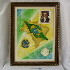 PINTURA (50X70 CM) SOBRE TELA, TEXTURIZADA, COM FUNDO NAS CORES AZUL, VERDE E AMARELO. NO CENTRO, O MAPA DO BRASIL COM A BANDEIRA NACIONAL. NO CANTO SUPERIOR DIREITO, FOTO DO PRESIDENTE LUIZ INÁCIO LULA DA SILVA; NO INFERIOR ESQUERDO, BRASÃO DA REPÚBLICA FEDERATIVA DO BRASIL. NO CANTO INFERIOR DIREITO, ASSINATURA DA ARTISTA, 'ÁUREA MAININE 05'. POSSUI MOLDURA (68X88 CM) EM TONS DE DOURADO E PASSE-PARTOUT CREME. ATRÁS, A INSCRIÇÃO 'PARA O OPERÁRIO SIMPLES QUE CHEGOU AO MAIS ALTO POSTO DO BRASIL. SUA EXCELÊNCIA O PRESIDENTE LUIS INÁCIO LULA DA SILVA / COM CARINHO / ÁUREA MAININE GARCIA / AGUDOS, 25/10/2005.'.