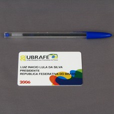 CARTÃO DE IDENTIFICAÇÃO (8,5X5,5 CM), COM FUNDO BRANCO E A INSCRIÇÃO '20 ANOS UBRAFE / UNIÃO BRASILEIRA DOS PROMOTORES DE FEIRAS / LUIZ INACIO LULA DA SILVA / PRESIDENTE / REPUBLICA FEDERATIVA DO BRASIL / 2006'. NO VERSO, 'ESTA CREDENCIAL É PESSOAL E INTRANSFERÍVEL. VÁLIDA PARA OS EVENTOS PROMOVIDOS PELAS EMPRESAS ASSOCIADAS À UBRAFE. PERMITE AO SEU PORTADOR FAZER-SE ACOMPANHAR DE UMA PESSOA.'. POSSUI PARTE DA LOGOMARCA 'MARCA BRASIL', NO CANTO INFERIOR DIREITO. ACOMPANHA CARTÃO DE VISITA DO REMETENTE.