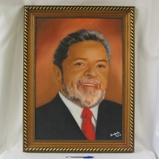 PINTURA SOBRE TELA (49X69 CM), RETRATANDO O PRESIDENTE LULA, COM TERNO PRETO E GRAVATA VERMELHA. FUNDO EM TONS DE MARROM. PINTURA COM APARÊNCIA DE EMBAÇADA/FORA DE FOCO. NO CANTO INFERIOR DIREITO, ASSINATURA DO ARTISTA, 'EURÍPEDES 2005'. MOLDURA (63X83 CM) EM MADEIRA TRABALHADA, EM TONS DE DOURADO E PRETO.