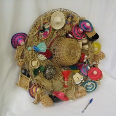 CHAPÉU (52X52X10,5 CM) CONFECCIONADO EM TIRAS DE BAMBU/VIME, COM DIVERSAS MINIATURAS PRESAS NA ABA, COMO CHAPÉUS DE PALHA, CESTAS E BOLSAS, FLORES SECAS, CUIAS PINTADAS, MÁSCARAS EM ARGILA, BONECAS DE PALHA E FIBRA VEGETAL, E TAMANCOS DE MADEIRA.
