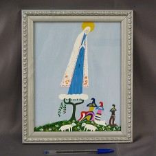 PINTURA (19X24 CM) SOBRE MADEIRA, MOSTRANDO NOSSA SENHORA DE FÁTIMA SOBRE UMA ÁRVORE, COM TRÊS MULHERES REZANDO AOS SEUS PÉS, E DUAS OVELHAS NA FRENTE. PINTURA COM FUNDO AZUL CELESTE, PREDOMINANDO OS TONS DE VERDE, BRANCO E AZUL. NO CANTO INFERIOR ESQUERDO, ASSINATURA DO ARTISTA 'ERMIRIO'. EMOLDURADA EM PORTA-RETRATO (24,5X29,5 CM) DE MADEIRA PINTADA DE PRATEADO. ATRÁS, PAPEL COLADO COM FITA ADESIVA, CONTENDO A INSCRIÇÃO 'SÃO MAIS DE 100 TELAS DOADAS PARA IGREJA / CASAS. RIO VERDE. JATAI. GOIANIA - BARRA DO GARÇAS / SÃO PAULO - BAHIA - DE 1982 - ATÉ 2005 MAIS DE 100 PINTURAS. ARTE SACRA DOAÇÕES'.