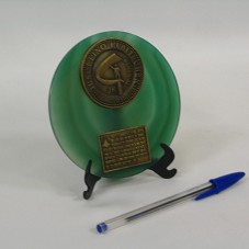 PLACA CIRCULAR (12X12 CM), EM CRISTAL ESVERDEADO. NA FRENTE, MEDALHA (5,5X5,5 CM) EM BRONZE, COM A INSCRIÇÃO 'JUSCELINO KUBITSCHECK / FUNDADOR DE BRASÍLIA' CIRCUNDANDO-A, E, AO CENTRO, O MONUMENTO DO 'MEMORIAL JK'. NA PARTE INFERIOR, OUTRA PLACA, EM MESMO MATERIAL, COM A INSCRIÇÃO 'DESTE PLANALTO CENTRAL DESTA SOLIDÃO QUE EM BREVE SE TRANSFORMARÁ EM CÉREBRO DAS ALTAS DECISÕES NACIONAIS, LANÇO OS OLHOS MAIS UMA VEZ SOBRE O AMANHÃ DO MEU PAÍS E ANTEVEJO ESTA ALVORADA COM FÉ INQUEBRANTÁVEL E UMA CONFIANÇA SEM LIMITES NO SEU GRANDE DESTINO / JK'. ACOMPANHA SUPORTE DE MESA, EM PLÁSTICO PRETO. ACONDICIONADA EM ESTOJO PRETO.