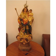 ESCULTURA (60 CM - ALTURA ESTIMADA) EM ARGILA POLICROMADA, IMAGEM DE NOSSA SENHORA DOS PRAZERES, SEGURANDO UMA CRIANÇA EM UM DOS BRAÇOS, E UM BASTÃO EM OUTRO. AOS SEUS PÉS, CABEÇAS DE CRIANÇAS/ANJOS, POSSUI UMA COROA EM METAL DOURADO. NA BASE, PLACA COM A INSCRIÇÃO 'NOSSA SENHORA DOS PRAZERES / PADROEIRA DAS TROPAS BRASILEIRAS / 19 DE ABRIL DE 1648 - 1ª BATALHA DOS GUARARAPES / AUTOR DA OBRA: ELIAS SULTANUM / OLINDA-PE OUTUBRO 2005'.