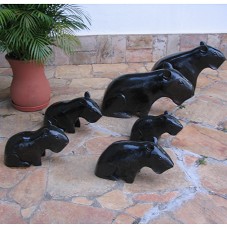 CINCO ESCULTURAS (TAMANHOS DIVERSOS) EM MADEIRA MACIÇA ESCURA, REPRESENTANDO UMA FAMÍLIA DE CAPIVARAS, COMO SE ESTIVESSEM SENTADAS.