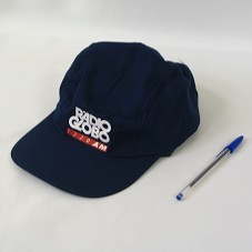 BONÉ EM TECIDO AZUL MARINHO. NA FRENTE, ESTAMPA EM BRANCO E VERMELHO, 'RÁDIO GLOBO / 1220 AM'.