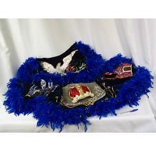 CAPA EM VELUDO AZUL MARINHO, FORRADA EM CETIM AZUL, COM PENAS AZUIS NAS BORDAS. NA PARTE CENTRAL, POSSUI UM BRASÃO CINZA COM UMA COROA, EM ALTO RELEVO, CONFECCIONADA EM CETIM VERMELHO COM AROS EM LANTEJOULAS DOURADAS, E UMA POMBA BRANCA ACIMA DELA. NAS LATERAIS, UM CASTELO EM AZUL E OUTRO EM VERMELHO. POSSUI A INSCRIÇÃO 'JARAGUÁ GOIÁS'.