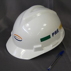 CAPACETE DE OBRA, DE PROTEÇAÕ, EM PLÁSTICO BRANCO. NA FRENTE, ETIQUETA COM A INSCRIÇÃO 'MAUÁ-JURONG'. NAS LATERAIS, EM AZUL, 'PRE', ENTRE FAIXAS VERDE E AMARELA. ATRÁS, 'LULA'.