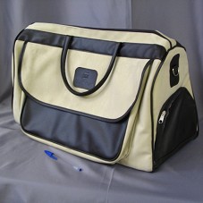BOLSA DE VIAGEM (52,5X25X31 CM) EM MATERIAL EMBORRACHADO, NA COR BEGE, PARECENDO COURO, COM DETALHES EM COURO MARROM. POSSUI ALÇA CURTA E LONGA, DOIS BOLSOS LATERAIS E UM FRONTAL. NA FRENTE, PLACA EM COURO MARROM COM A GRAVAÇÃO 'BR FPSO P-50' E LOGOMARCA DA PETROBRÁS.