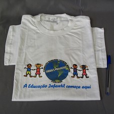 CAMISETA (TAM. NÃO INDICADO) EM MALHA BRANCA, DE MANGA CURTA. NA PARTE FRONTAL, ESTAMPA COM DESENHO DE CRIANÇAS DE MÃOS DADAS, COM O GLOBO MUNDI NA PARTE CENTRAL, E A INSCRIÇÃO 'FUNDAÇÃO RAIMUNDO TEIXEIRA MENDES / ORDEM E PROGRESSO / FURTEME / A EDUCAÇÃO INFANTIL COMEÇA AQUI'.