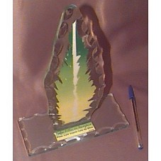 TROFÉU (25X19X07 CM) 'FILHOS DA AMAZÔNIA' CONFECCIONADO EM VIDRO, NO FORMATO DE UMA FOLHA, COM DESENHO ESVERDEADO AO CENTRO. POSSUI BASE EM MESMO MATERIAL.