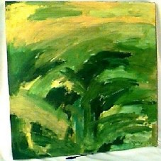 QUADRO (81X80CM), SEM MOLDURA, CONTENDO PINTURA ABSTRATA EM TONS DE AMARELO E VERDE. NO VERSO TEM-SE A INSCRIÇÃO 'LULA ESTE QUADRO É PARA VOCÊ. / DE GREGÓRIO DA APSWDOWN / TÍTULO: SAMBA'.