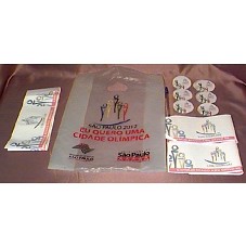 SACOLA, CONFECCIONADA EM PLÁSTICO; 33 (TRINTA E TRÊS) ADESIVOS (60MM) REDONDOS, CONFECCIONADOS EM PAPEL, E 16 (DEZESSEIS) ADESIVOS (100X190MM) RETANGULARES, CONFECCIONADOS EM PLÁSTICO, TRAZENDO ESTAMPADOS A LOGOMARCA DA CAMPANHA QUE VISA SEDIAR NA CIDADE DE SÃO PAULO OS JOGOS OLÍMPICOS DE 20012, REPRESENTADA POR CINCO FIGURAS HUMANAS ESTILIZADAS, NAS CORES AZUL, AMARELO, PRETO, VERDE E VERMELHO, APOIADAS EM UM TRAÇO AZUL, E A INSCRIÇÃO 'SÃO PAULO 20012 / EU QUERO UMA CIDADE OLÍMPICA'.