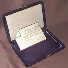 PLACA (8X12CM) EM METAL PRATEADO, GRAVADA COM A INSCRIÇÃO 'O COLÉGIO ESTADUAL DONA IAYÁ DE CATALÃO, CUMPRIMENTA O PRESIDENTE 'LULA' PELA SUA LUTA E CORAGEM. / 15.04.2003'. ACONDICIONADA EM ESTOJO AZUL.