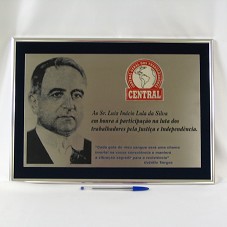 PLACA (40X26 CM) EM METAL PRATEADO. POSSUI A INSCRIÇÃO 'AO SR. LUIZ INÁCIO LULA DA SILVA / EM HONRA À PARTICIPAÇÃO NA LUTA DOS TRABALHADORES PELA JUSTIÇA E INDEPENDÊNCIA. / CADA GOTA DE MEU SANGUE SERÁ UMA CHAMA IMORTAL NA VOSSA CONSCIÊNCIA E MANTERÁ A VIBRAÇÃO SAGRADA PARA A RESISTÊNCIA - GETÚLIO VARGAS'. POSSUI FOTOGRAFIA DE GETÚLIO VARGAS NO CANTO ESQUERDO, E, EM ALTO RELEVO, 'CENTRAL GERAL DOS TRABALHADORES / CENTRAL'. FIXADA EM MOLDURA PRATEADA COM PASSE-PARTOUT EM VELUDO AZUL MARINHO. ACONDICIONADA EM SACO DE MESMO TECIDO.