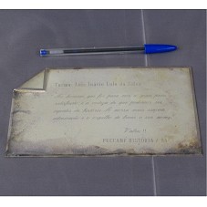 PLACA (19X12 CM) EM PRATA, COM UMA DAS PONTAS DOBRADAS, BORDAS POLIDAS E INTERIOR FOSQUEADO. POSSUI A INSCRIÇÃO 'TURMA: LUIS INÁCIO LULA DA SILVA / AO HOMEM QUE FOI PARA NÓS A MAIS PURA SATISFAÇÃO E A CERTEZA DE QUE PODEMOS SER AGENTES DA HISTÓRIA. A NOSSA MAIS SINCERA ADMIRAÇÃO E O ORGULHO DE LEVAR O SEU NOME. VALEU. PUCCAMP HISTÓRIA/94'. ACONDICIONADA EM ESTOJO FORRADO DE TECIDO AZUL MARINHO.