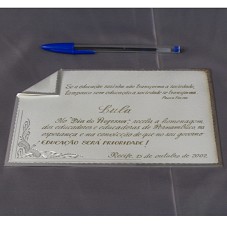 PLACA (20X14 CM) EM PRATA, COM UMA DAS PONTAS DOBRADAS, BORDAS POLIDAS E INTERIOR FOSQUEADO. POSSUI A INSCRIÇÃO 'SE A EDUCAÇÃO SOZINHA NÃO TRANSFORMA A SOCIEDADE, TAMPOUCO SEM EDUCAÇÃO A SOCIEDADE SE TRANSFORMA. PAULO FREIRE / LULA NO DIA DO PROFESSOR, RECEBA A HOMENAGEM DOS EDUCADORES E EDUCADORAS DE PERNAMBUCO, NA ESPERANÇA E NA CONVICÇÃO DE QUE NO SEU GOVERNO EDUCAÇÃO SERÁ PRIORIDADE / RECIFE, 15 DE OUTUBRO DE 2002'. ACONDICIONADA EM ESTOJO FORRADO DE TECIDO AZUL MARINHO.