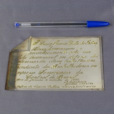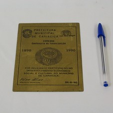 PLACA (10,5X17 CM) EM LATÃO. POSSUI A INSCRIÇÃO 'PREFEITURA MUNICIPAL DE CARIACICA / COMENDA CENTENÁRIO DE EMANCIPAÇÃO / 1890 1990 / POR RELEVANTE PARTICIPAÇÃO NO DESENVOLVIMENTO ECONÔMICO SOCIAL E CULTURAL DO MUNICÍPIO DE CARIACICA. VASCO ALVES PREFEITO MUNICIPAL / 24-06-90'.