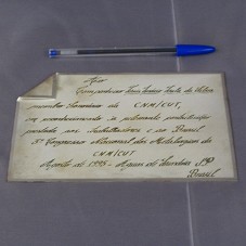 PLACA (14X10 CM) EM PRATA, COM BORDA POLIDA E UMA DAS PONTAS DOBRADAS. POSSUI A INSCRIÇÃO 'A LUIZ INÁCIO LULA DA SILVA / NOSSA HOMENAGEM E RECONHECIMENTO PELA SUA LUTA INCANSÁVEL EM DEFESA DOS INTERESSES DA CLASSE TRABALHADORA. SINDICATO DOS TRABALHADORES EM EMPRESAS FERROVIÁRIAS DA CENTRAL DO BRASIL / RIO DE JANEIRO / 16 OUTUBRO 1995 / A DIRETORIA / GESTÃO 1994/96 / EM DEFESA DA FERROVIA PÚBLICA STEFZCB /CUT/FNITST'. ACONDICIONADA EM ESTOJO FORRADO DE TECIDO AZUL CLARO.