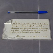 PLACA (16X10 CM) EM PRATA, COM UMA DAS PONTAS DOBRADAS; BORDAS POLIDAS E INTERIOR FOSQUEADO. CONTÉM A INSCRIÇÃO, EM DOURADO: 'AO ILUSTRE PRESIDENTE DE HONRA DO PARTIDO DOS TRABALHADORES SR. LUIZ INÁCIO LULA DA SILVA / HOMENAGEM DO SINDICATO DOS BANCÁRIOS DE PIRACICABA, PELA DIGNA E BRILHANTE PARTICIPAÇÃO NA LUTA PELA DEFESA DOS INTERESSES DOS TRABALHADORES. PIRACICABA 20 DE AGOSTO DE 1999'. ACONDICIONADA EM ESTOJO FORRADO DE TECIDO AZUL CLARO.