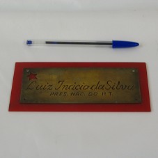 PLACA (14,5X6 CM) EM LATÃO, COM A INSCRIÇÃO, RECORTADA NA PLACA, 'LUIZ INÁCIO LULA DA SILVA / PRES. NAC. DO P.T.'. POSSUI UMA ESTRELA NA PARTE SUPERIOR ESQUERDA. FIXADA EM PLACA DE ACRÍLICO VERMELHO (17X8,5 CM). FALTAM DOIS PARAFUSOS DE FIXAÇÃO.