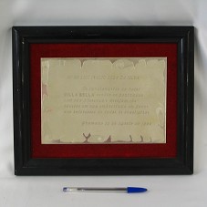 PLACA (23,5X16 cM) EM PRATA DOURADA, COM INTERIOR FOSCO E BORDAS POLIDAS. POSSUI A INSCRIÇÃO 'AO SR. LUIZ INÁCIO LULA DA SILVA / OS FUNCIONÁRIOS DO HOTEL VILLA BELLA SENTEM-SE HONRADOS COM SUA PRESENÇA E DESEJAM-LHE SUCESSO EM SUA EMPREITADA EM FAVOR DOS INTERESSES DE TODOS OS BRASILEIROS / GRAMADO, 11 DE AGOSTO DE 1994.'. FIXADA EM QUADRO COM MOLDURA PRETA E PASSE-PARTOUT EM VELUDO VERMELHO.