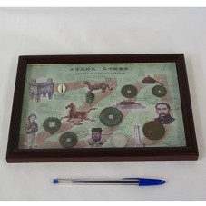 QUADRO (26,5X18 CM) INTITULADO 'A HISTORY OF CHINESE CURRENCY', CONTENDO NOVE TIPOS DE MOEDAS CHINESAS, DISPOSTAS SOBRE DESENHO DA MURALHA DA CHINA, MOSTRANDO ORDEM CRONOLÓGICA DAS DINASTIAS,SITUANDO, DESSA FORMA, CADA MOEDA. ACOMPANHA FOLHETO COM HISTÓRICO DA PEÇA; OUTRO COM CERTIFICADO DE GARANTIA; E, CARTÃO DE VISITA DO REMETENTE. ACONDICIONADO EM ESTOJO VERMELHO COM IDEOGRAMAS CHINESES NA TAMPA.
