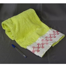 TOALHA (70X135 CM) DE BANHO, NA COR VERDE CÍTRICO, COM BARRA BORDADA EM DEGRADÊ DA COR VINHO, COM MOTIVOS GEOMÉTRICOS.