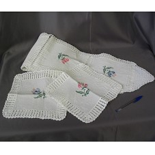 CAMINHO DE MESA (25X190 CM), NA COR BRANCA, COM BARRA E BICO DE CROCHÊ, E BORDADOS COM MOTIVOS FLORAIS. ACOMPANHA DUAS TOALHINHAS (27X27 CM) EM MESMO MATERIAL, BARRADO EM CROCHÊ E UMA FLOR ROSA E AZUL BORDADA EM CADA UMA.