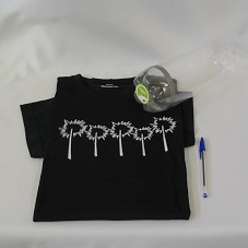 CAMISETA (TAM G) EM MALHA PRETA, DE MANGA CURTA. NA FRENTE, ESTAMPA, EM BRANCO, ESTILIZADA DE FLORES. ATRÁS, EM BRANCO, 'PROJETO CRESCER / BOA VISTA - RORAIMA / BRASIL'. ACONDICIONADA EM EMBALAGEM DE GARRAFA PET RECICLADA, COM SELO DO PROGRAMA.