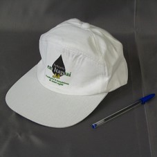 BONÉ EM BRIM BRANCO. NA FRENTE, ESTAMPA MOSTRANDO UMA GOTA PRETA, E A INSCRIÇÃO 'REFINARIA EM ITAGUAÍ JÁ / O COMBUSTÍVEL DO DESENVOLVIMENTO DE NOSSA REGIÃO'.