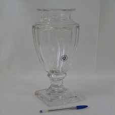 JARRO/VASO EM CRISTAL (15X15X30 CM), COM BASE QUADRADA, BOJO COM DOZE LADOS E BOCA CIRCULAR. POSSUI A COROA REAL E AS INICIAIS 'MFP' GRAVADOS NA FRENTE; E ETIQUETA 'VAL SAINT LAMBERT'. NO FUNDO DA BASE, O NOME DO FABRICANTE GRAVADO. ACONDICIONADO EM ESTOJO FORRADO DE NAPA VINHO, COM MESMA COROA E INICIAIS NA TAMPA. ACOMPANHA CARTÃO DO REMETENTE.