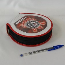 PORTA-CD PORTÁTIL, COM CAPACIDADE PARA TRINTA E SEIS CD'S, EM PLÁSTICO, COM O SÍMBOLO DO 'S.C. CORINTHIANS PAULISTA' DOIS DOIS LADOS E A INSCRIÇÃO 'TIMÃO'. INTERIOR EM TNT PRETO.