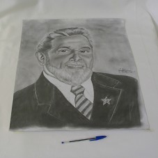 DESENHO (48,5X59 CM) EM CARTOLINA, A GRAFITE, RETRATANDO O PRESIDENTE LULA VESTINDO PALETÓ, COM BROCHE DA ESTRELA DO 'PT' NA LAPELA. NA PARTE INFERIOR DIREITA, ASSINATURA DO ARTISTA 'MARCELA SOUZA 2005 / ITAQUITINGA - PE'. ATRÁS, DADOS PESSOAIS DO REMETENTE.