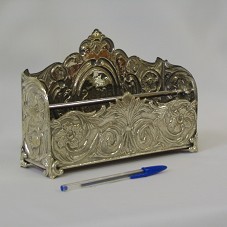 PORTA- CARTA (23X7,5X17 CM), TIPO CAIXA ABERTA, EM FOLHA METÁLICA TRABALHADA COM MOTIVOS FLORAIS E DE ARABESCOS. NA PARTE POSTERIOR, A INSCRIÇÃO 'L.I.DA S.'. BASE INTERNA FORRADA EM VELUDO MARROM. POSSUI, INTERNAMENTE, DIVISÓRIA EM HASTE METÁLICA CIRCULAR. ACONDICIONADA EM ESTOJO FORRADO DE NAPA AZUL MARINHO. ACOMPANHA DOIS CARTÕES DE VISITA DO REMETENTE.