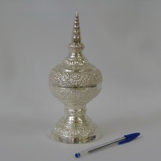 OBJETO TIPO ÂMBULA (9X9X22 CM), EM PRATA, TRABALHADA COM ARABESCOS EM ALTO RELEVO. POSSUI NA PARTE SUPERIOR DA TAMPA, FINALIZAÇÃO PONTIAGUDA, COMO UM CONE; E BOJO EM FORMATO CIRCULAR. ACONDICIONADA EM ESTOJO FORRADO DE VELUDO VERMELHO. ACOMPANHA CARTÃO DE VISITA DO REMETENTE.