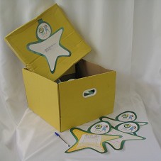 CAIXA DE PAPELÃO AMARELO, CONTENDO 451 (QUATROCENTOS E CINQÜENTA E UM) EXEMPLARES, NO FORMATO ESTILIZADO DE UMA CRIANÇA, COM BORDAS VERDES E INTERIOR BRANCO. NA CABEÇA, FOTO DE UMA CRIANÇA E A INSCRIÇÃO '2ª SEMANA CRIANÇA SEGURA / SAFE KIDS BRASIL / JOHNSON & JOHNSON'. NA PARTE MAIOR, EM CADA UM DOS EXEMPLARES, UM DESENHO DE UMA CRIANÇA.