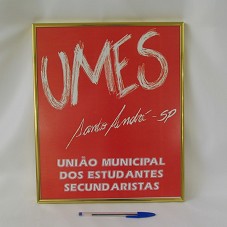 QUADRO (30,5X36,5 CM) COM FUNDO VERMELHO E INSCRIÇÃO BRANCA, 'UMES SANTO ANDRÉ-SP / UNIÃO MUNICIPAL DOS ESTUDANTES SECUNDARISTAS'. POSSUI MOLDURA METÁLICA DOURADA.