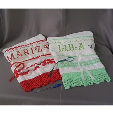 DUAS TOALHAS DE BANHO (130X80 CM CADA), NA COR BRANCA. A PRIMEIRA, BORDADO EM VERDE PRÓXIMO À BARRA, 'PRES. LULA' E DESENHOS DE PEIXES. POSSUI BICO EM CROCHÊ VERDE, DETALHE EM FITA DE CETIM BRANCO E UMA FITA DO SENHOR DO BONFIM. A SEGUNDA, BORDADO EM VERMELHO, 'P.D. MARIZA' E DESENHOS DE BORBOLETAS; POSSUI BICO EM CROCHÊ NA MESMA COR, FITA DE CETIM BRANCO E UMA DO SENHOR DO BONFIM.