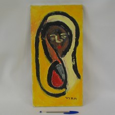 PINTURA SOBRE TELA (20X40 CM), EM FUNDO AMARELO, MOSTRANDO O ROSTO DE UMA MULHER. NO CANTO INFERIOR DIREITO, ASSINATURA DO ARTISTA, 'VERA'.