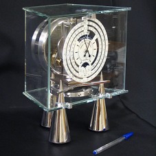 RELÓGIO (16X12X18 CM) DE MESA, EM AÇO INOX, COM CORPO METÁLICO. FAZ MARCAÇÃO ANUAL, MOSTRANDO OS ANOS DE 2000 A 3000; OS MESES E AS FASES DA LUA. ACONDICIONADO EM REDOMA DE VIDRO (23X14X219,5 CM) COM PÉS CÔNICOS EM AÇO. ACOMPANHA DUAS CHAVES PARA REGULAGEM. ACONDICIONADO EM MALETA PRETA COM DETALHES EM METAL DOURADO; POSSUINDO CADEADO FIXO COM SEGREDO NUMÉRICO.