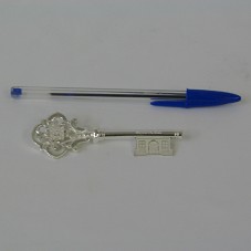 CHAVE DA CIDADE DE BOGOTÁ (3,5X9,5 CM) EM METAL PRATEADO. NO SEGREDO, FACHADA DE UM PRÉDIO; ACIMA DELE, A INSCRIÇÃO 'BOGOTÁ, D.C.'. PARTE SUPERIOR TRABALHADA COM ARABESCOS, TENDO O BRASÃO DA CIDADE NO CENTRO. ACONDICIONADA EM ESTOJO FORRADO DE VELUDO AZUL MARINHO.