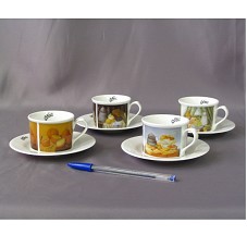 CONJUNTO PARA CAFÉ, EM PORCELANA, EM EDIÇÃO LIMITADA, COMPOSTO POR QUATRO XÍCARAS E QUATRO PIRES BRANCOS. EM CADA XÍCARA PINTURAS COM MOTIVOS CULINÁRIOS, REPRESENTANDO MESAS POSTAS PARA CAFÉ, LANCHES, COM FRUTAS, BOLOS, BULES, ETC. NO FUNDO DE CADA PEÇA, A INSCRIÇÃO 'PRODUCTO DEL MUSEO D ANTIOQUIA / EDICIÓN LIMITADA / CORONA'. CADA PEÇA RECEBE A ASSINATURA DO ARTISTA 'BOTERO'.