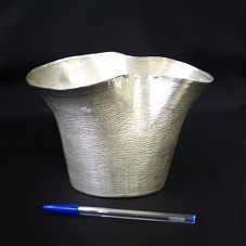 VASO/FLOREIRA (19,5X15X12,5 CM) EM FOLHA DE PRATA 925, COM BASE CIRCULAR E CORPO QUE SE ABRE FORMANDO UM CONE, COM ALGUMAS LATERAIS CURVADAS PARA DENTRO. ACOMPANHA CARTÃO DO REMETENTE E OUTRO COM A INSCRIÇÃO 'FLORERO HOJA SECA EN PLATA 9.25 / ELABORADO EN ESCUELA ARTES STO. DOMINGO'. ACONDICIONADO EM SACO DE TECIDO COM DESENHO EM 'ZIG-ZAG' NAS CORES PRETA E CINZA.