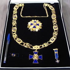 ORDEM DE BOYACÁ, NO GRAU DE GRÃ COLAR, COMPOSTA POR: COLAR EM METAL DOURADO, COM INSÍGNIA COMPOSTA POR UMA CRUZ AZUL COM AS PONTAS MAIS LARGAS, E UMA MOEDA NO CENTRO, COM EFÍGIE MASCULINA E A INSCRIÇÃO 'ORDEN DE BOYACA, NO REVERSO, 'REPUBLICA DE COLOMBIA, O CORDÃO, COMPOSTO POR MINIATURAS DA INSÍGNIA E AS INICIAIS 'OB'; UMA PLACA COM A INSÍGNIA RODEADA DE RAIOS DOURADOS; UM BÓTON CIRCULAR EM TECIDO AZUL, VERMELHO E AMARELO E UMA BARRETA COM MINIATURA DA INSÍGNIA PRESA À FITA. ACONDICIONADA EM ESTOJO FORRADO DE NAPA PRETA, TENDO NA TAMPA O BRASÃO DA REPÚBLICA DA COLÔMBIA, E O NOME DA ORDEM.