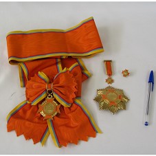 ORDEM DO CONGRESSO NACIONAL DA COLÔMBIA, NO GRAU DE GRÃ-CRUZ EXTRAORDINÁRIA COM PLACA DE OURO, COMPOSTA POR: FAIXA NA COR LARANJA, COM LISTRAS VERMELHA, AZUL E AMARELA, COM INSÍGNIA EM METAL DOURADO, COM UMA CRUZ DE MALTA EM LARANJA, E MOEDA SOBRE ELA, COM A FACHADA DO CONGRESSO GRAVADA E A INSCRIÇÃO 'ORDEN DEL CONGRESO DE COLOMBIA; UMA PLACA, COM MESMA INSÍGNIA, RODEADA DE RAIOS DOURADOS; UM BÓTON COM MINIATURA DA INSÍGNIA; E, UMA BARRETA, COM FITA E MINIATURA DA CONDECORAÇÃO. ACONDICIONADO EM ESTOJO FORRADO DE NAPA MARROM, COM UM BRASÃO NA TAMPA, E A INSCRIÇÃO 'REPUBLICA DE COLOMBIA / ORDEN DEL CONGRESO / GRADO GRAN CRUZ EXTRAORDINARIA'.