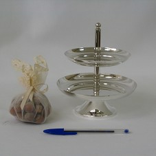 PETISQUEIRA (15,5X15,5X18 CM) EM METAL PRATEADO. POSSUI DOIS PRATOS, UM MAIOR NA PARTE INFERIOR; OUTRO MENOR, ACIMA DAQUELE; E, UMA HASTE NO CENTRO, FIXANDO OS DOIS. ACOMPANHA UM SACO EM TULE BEGE COM AVELÂS. ACONDICIONADA EM CAIXA DE PAPELÃO PRATEADO.