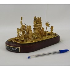 ESCULTURA (10,2X22X7,5 CM) EM METAL DOURADO, FIXADA EM BASE (11,5X24X3,5 CM) OVALADA DE MADEIRA, ONDE HÁ UMA PLACA METÁLICA, NA PARTE FRONTAL, COM A INSCRIÇÃO 'BALSA MUISCA / COLOMBIA'. REPRESENTA UMA BALSA CARREGANDO UM ENTE MAIOR, QUE PODE SER A REPRESENTAÇÃO DE UM DEUS, COM OUTRAS FIGURAS HUMANAS AO REDOR E À FRENTE. ALGUMAS DELAS USANDO MÁSCARAS E SEGURANDO BASTÕES. PERSONAGENS REMONTAM A FIGURAS INCAS/MAIAS/ASTECAS. ACONDICIONADA EM ESTOJO FORRADO DE FELTRO AZUL MARINHO. ACOMPANHA CARTÃO DE VISITA DO REMETENTE.