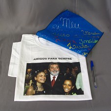 CAMISETA (TAM XG) EM MALHA BRANCA, DE MANGA CURTA. NA FRENTE, ESTAMPA COM FOTO DO PRESIDENTE ABRAÇANDO DUAS MENINAS E A INSCRIÇÃO 'AMIGOS PARA SEMPRE'. ACONDICIONADA EM SACO DE TNT AZUL, COM A INSCRIÇÃO EM COLA COLORIDA, 'MEU ETERNO E VERDADEIRO AMIGO LUIZ INÁCIO LULA / DIANA E EMILY'.